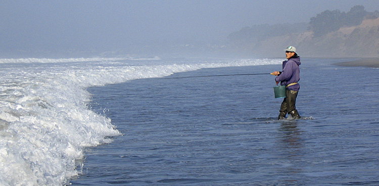 A super-nice morning to be out, despite difficult conditions. Weather was beautiful, blue sky with no wind. Today I met up with zen flyfishing guru Glenn Yoshimoto (grin), to fish the beach together. I have a couple of hours in the morning; he has all day. Lucky guy.