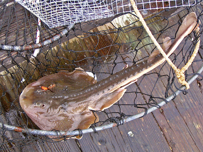 Aaanywaaay. The surf was too wild at newbrighton, and tons of kelp junk in the water (as usual) so I drove down to the Seacliff pier to try my luck there. As it turned out, I caught a fish: I was on the right side, casting my little glo-grub fly here and there. this time I had cast along the pier and was retrieving it slowly. The line went dead and heavy, and I assumed it was a big chunk of kelp or something, but when I got it to the surface I saw it is a ray or a skate of some kind. It had gotten snagged on the top, poor thing. A guy next to me had a crab net, so we hauled it up, photographed it and let it back down again. It was something over 2 feet long, with two rows of sharp spines going down its back.