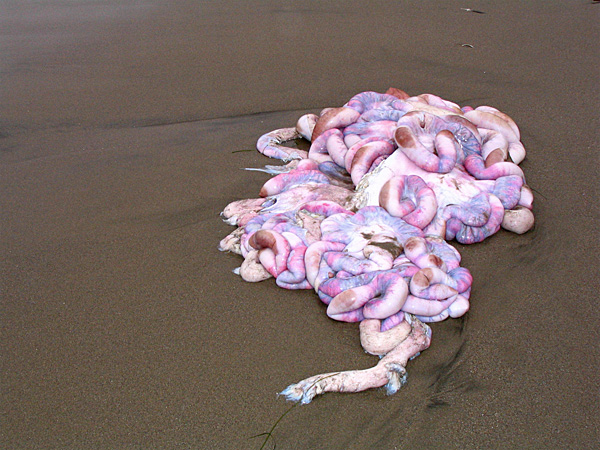 Anyway, I head down and start casting. I go south a little, but not much, before heading north. There is a bit of kelp salad in the surf, and some larger chunks too. I then notice a woman on the beach looking at some pink thing thats floating in the surf.. looks like a large sweater or something. Wow, its a bunch of intestines! I'm guessing leftovers of a baby gray whale, after the local pod of orcas had their way with it (this happens regularly during the gray whale migration ).