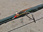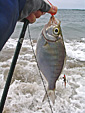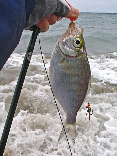 Manresa beach, around 10am. Surf looks ok, weather is overcast. I rig up and head down.. flies for today is an orange fly with brown tail, plus a rusty squirrel clouser. (I'm out of surf-mikis and need to tie more. In the meantime I have a bunch of other flies to use up). I debarb the rusty squirrel, thinking I'll probably regret that later.