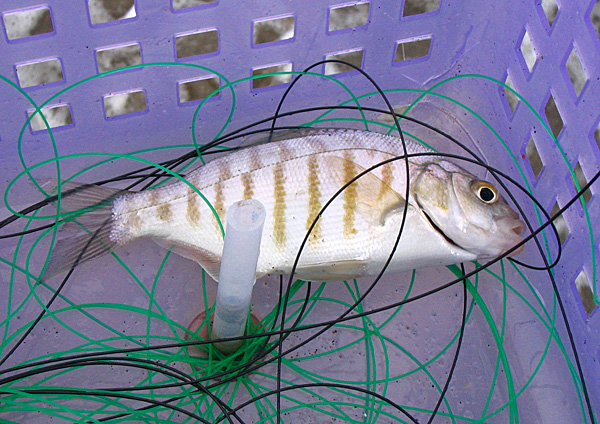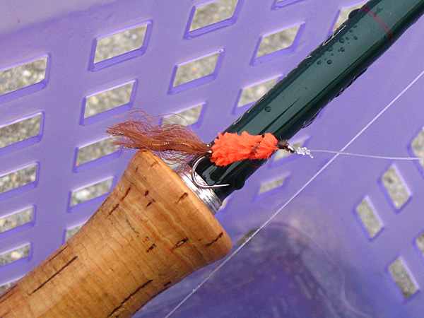 Ok, passsed the floating guts, and the next cast I feel a fish on, but it shakes loose. My appetite is whetted. I work myself further toward the trestle, and have another hit which sticks. A nice walleye, and what feels like the first real flyrod perch of the year. Whohoo! A little later I have a good SOLID hit, and almost get the fish all the way in, before it shakes loose. It took the rusty squirrel, as I could see the orange fly but not the fish, so at this point I'm wishing I hadn't debarbed the squirrel. Dangit. Next cast I have another fish on, almost as strong, and it shakes loose too. Well heck, looks like perch season has opened for me, finally. I end up with one more fish landed -- a small barred perch -- and one more hit felt.