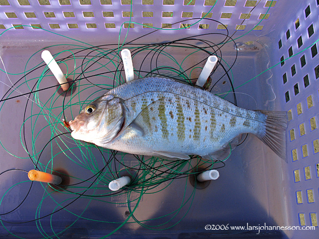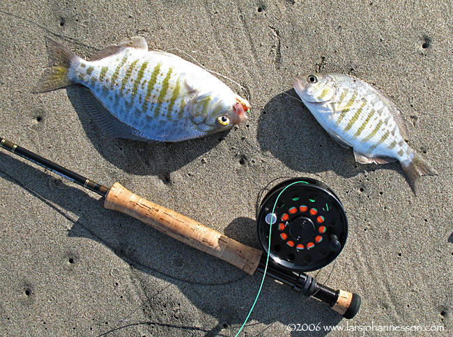 I catch another small one and then get a good hit, though it feels a little odd; turns out its a DOUBLE :). Geez, I haven't had one of those in a while. I release the first fish and go back to the second; I notice I managed to tangle myself on the line and I just dragged my rod and reel several feet in the sand. This shows how absolutely VITAL it is to have a reel that you can take apart easily, dunk in the sea to get rid of the sand, and put back together again working. Shortly thereafter Deva brings in a nice fish, and a little later a REAL nice one -- I measure it against my rod handle.. a very nice 12 incher.