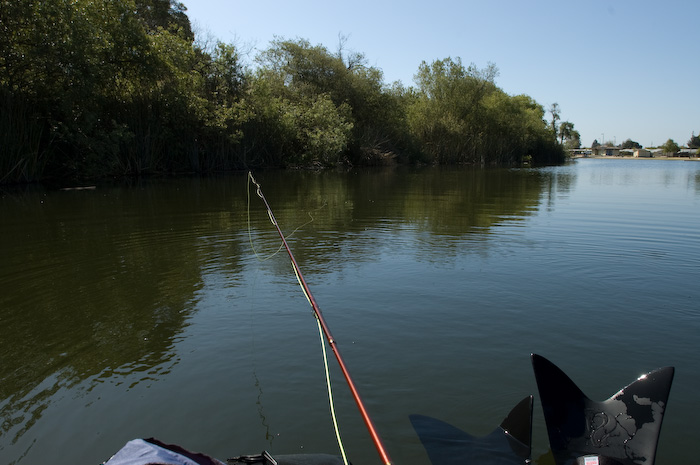 Deva is already there in his orange kayak. Comes in to say hi and get something from the car while I'm rigging up. This is my 2nd float tube outing. Water is, well.. not exactly clear, but not as bad as it will be later in summer, either. A number of other folks are there fishing. Some shore based, some in boaats.