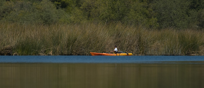 After a while I get tired of throwing the worm and go back to flycasting. I switched line to the 8wt sinking outbound, which works just fine. I try with a weedless brown/sparkly wooly bugger, but no takes. Do a little dragging it along the tulie bank, kindof like trolling.. no takes. Later I switch back to the markfly, but no takes there either. I got all the way to the first 'point' on the right side of the lake, and fished the same area going back. Took some photos with the tele-lens on the way back too.