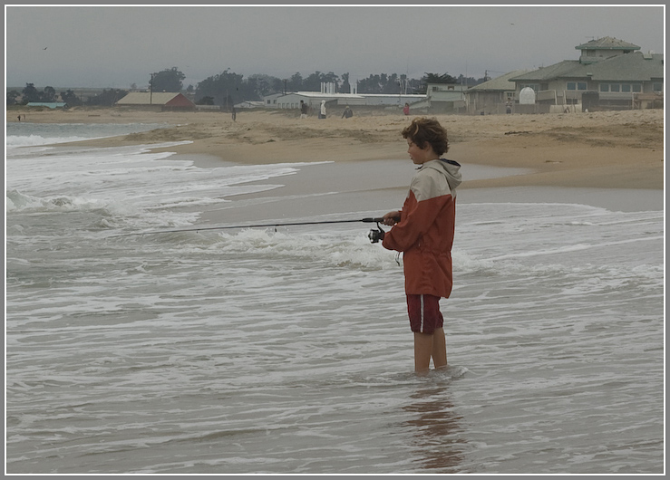 Nils needs a little help with the basics of casting his spinning outfit, but gets the hang of it fairly quickly. He seemed to have a good time, even though no fish were caught. We got passed by a bunch of people on horses, leaving manure in the sand. Nils got tangled up and needed to redo his leader. On the way out we talked to a guy who had fished around here, who said he never caught anything on this beach, but further south by the dunes / condos was good, and further north (Watsonville) was also good.