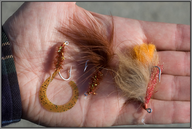 It is low tide. I'm rigged up with the 10' 9wt, etc, and 3 brand new flies.. all crab/worm patterns. First is a bunnyfly crab, next a zen worm, next a wormtail. All on jig hooks, all new.