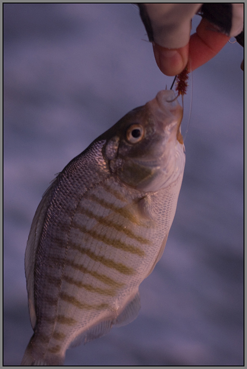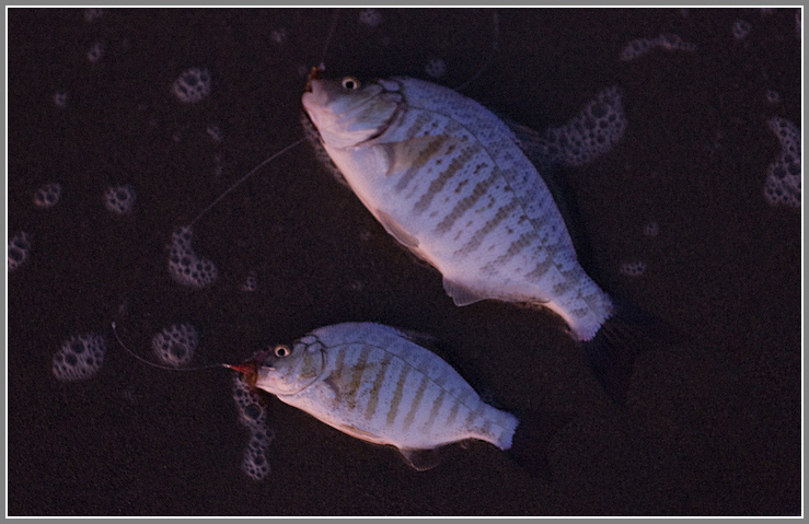 Then I get a fish.. a small perch that took the big bunny fly. I thought the idea of the bigger flies was to keep the small fish off.. oh well. I cast a bunch more, and it starts to get dark. Then I get a second fish. Shortly after I get a GOOD bite, and pull in a DOUBLE. The fish are getting progressively bigger, hehe. Now it is getting seriously dark, and I'm having trouble seeing my line as I cast it. Beautiful out.