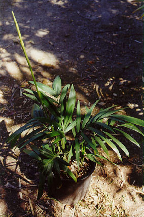 These palms are _very_ cold hardy, and mine has sat out in frosty 26F nights without any apparent damage. There seems to be 2 forms; one without a trunk, like mine, and one with a trunk. The little "suckers" you see in the pot seemed to actually be more germinated seeds. I transplaned them, and no other suckers have appeared so far. This palm seems to need a fair amount of fertilizer (at least in a pot) as it will otherwise grow small leaves, putting most of it's energy into making the infloresences. |