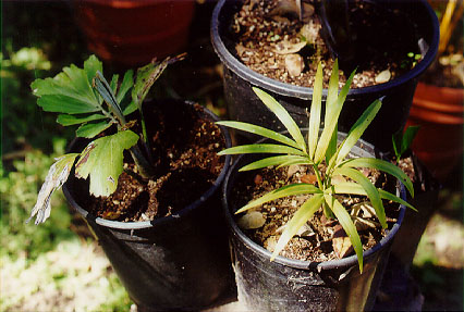 On left is an Arenga engleri, on right is a Dypsis onilahensis. These seedlings are _very_ slow growing. The Arenga tolerates frosty nights just fine. The Dypsis had some leaf burn last winter, but came back fine. Better protect it until it gets bigger, so as to not set the plant back too much. |